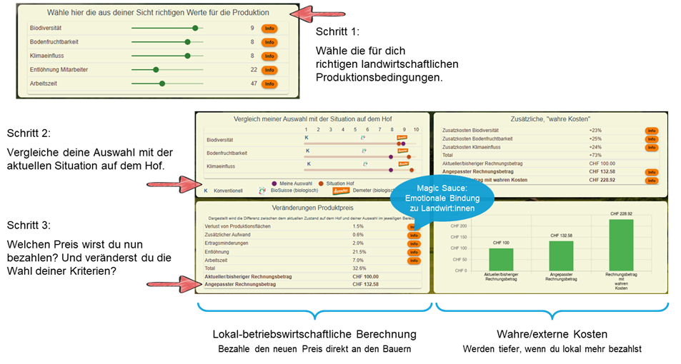 - Konsument:innen treffen ihre Wahl im Moment des Kaufs: Sie können spielerisch und interaktiv die Produktionsbedingungen auswählen, die ihnen wichtig sind – sei es Tierwohl, Biodiversität, Klimaschutz oder soziale Faktoren wie die Entlöhnung der Landwirt:innen.